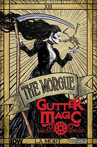 [easyazon_link identifier=”B01BCYTLQ6″ locale=”US” tag=”bounintocomi-20″]Gutter Magic #2[/easyazon_link] continues to provide an interesting story, expanding on the world, and introducing new and dangerous characters. This second issue starts off with a tense action scene as Cinder and Blacktooth are cornered by Shiver and her gang. Rich Douek’s dialogue is pretty solid and at times a little lighthearted. He even pokes fun at the showdown between Shiver and Cinder in his exposition referencing high noon despite previously informing us it is 10:25 a.m. There are some unnecessary moments. For example, he decides to use Blacktooth to provide exposition regarding the shop owner, Foulroot. He tries to convey Foulroot’s response through Blacktooth instead of just through Foulroot. He fills up three panels where he only really needed one. It also diminishes the emotion of the scene. Foulroot’s righteous anger is lost in Blacktooth’s nonchalant attitude.