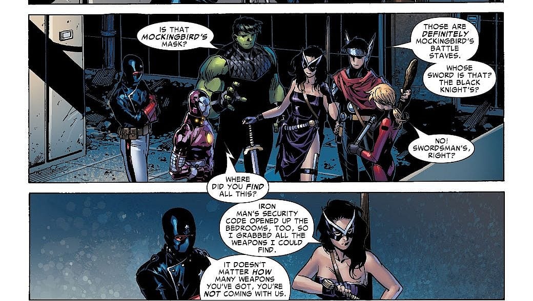 In fact, in her first outing with the Young Avengers Kate Bishop would use Mockingbird’s Battle Staves and mask, Swordsman’s sword, Black Widow’s utility belt, and Hawkeye’s bow.