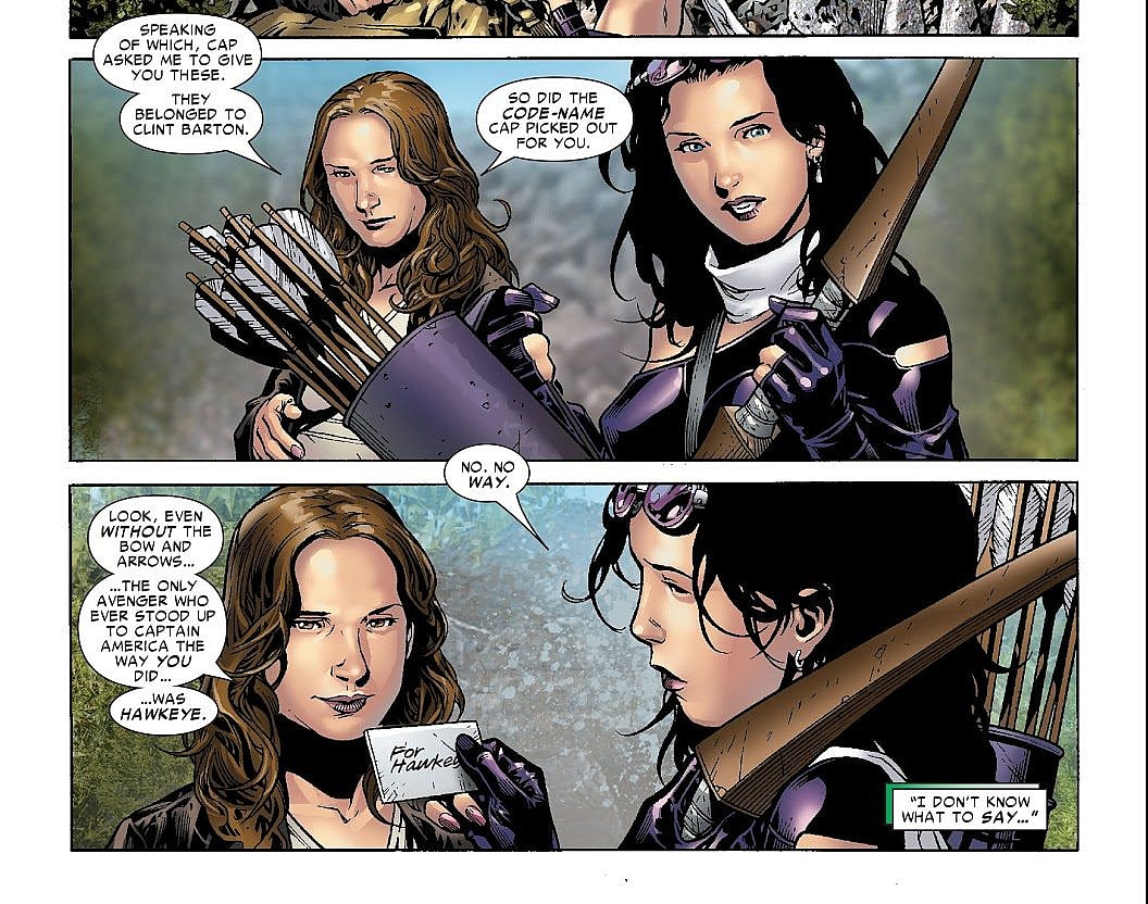 However, the team would be disbanded by Captain America and Iron Man and their gear confiscated. But Captain America eventually came to his senses and sent Jessica Jones to Kate with the original Hawkeye’s bow and arrows with a note confirming her new title of Hawkeye in Young Avengers #12.