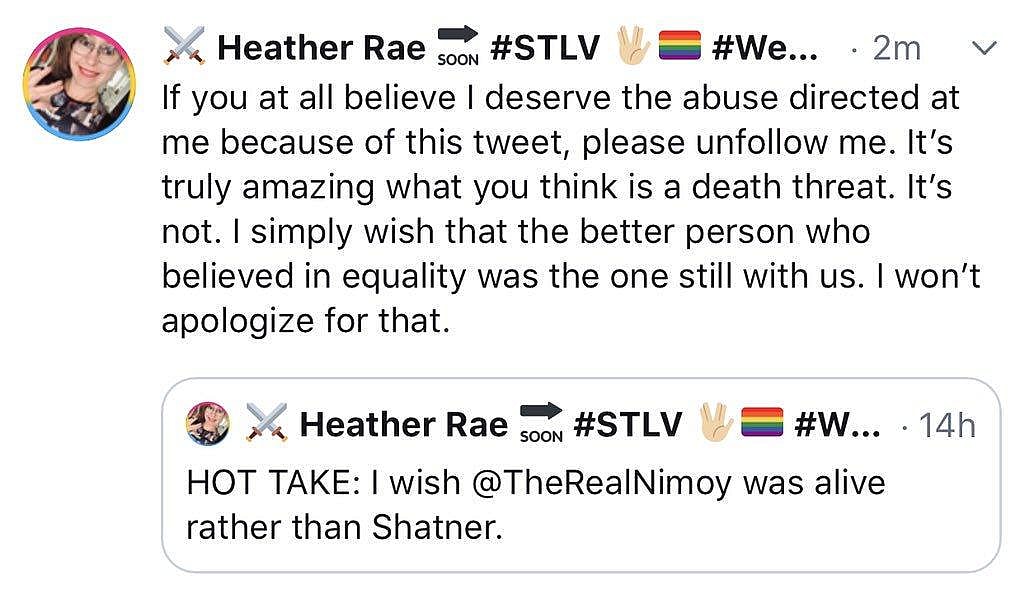 Heather Rae of The Tricorder Transmissions, a Star Trek centric podcast, took to Twitter to wish William Shatner was dead.