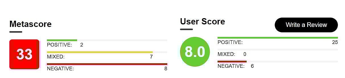And it’s not just Rotten Tomatoes. Metacritic features a number of these same reviewers. Their Metascore from critics sits at 33. However, the User Score is 8.0. It has 25 positive reviews and 6 negative reviews.