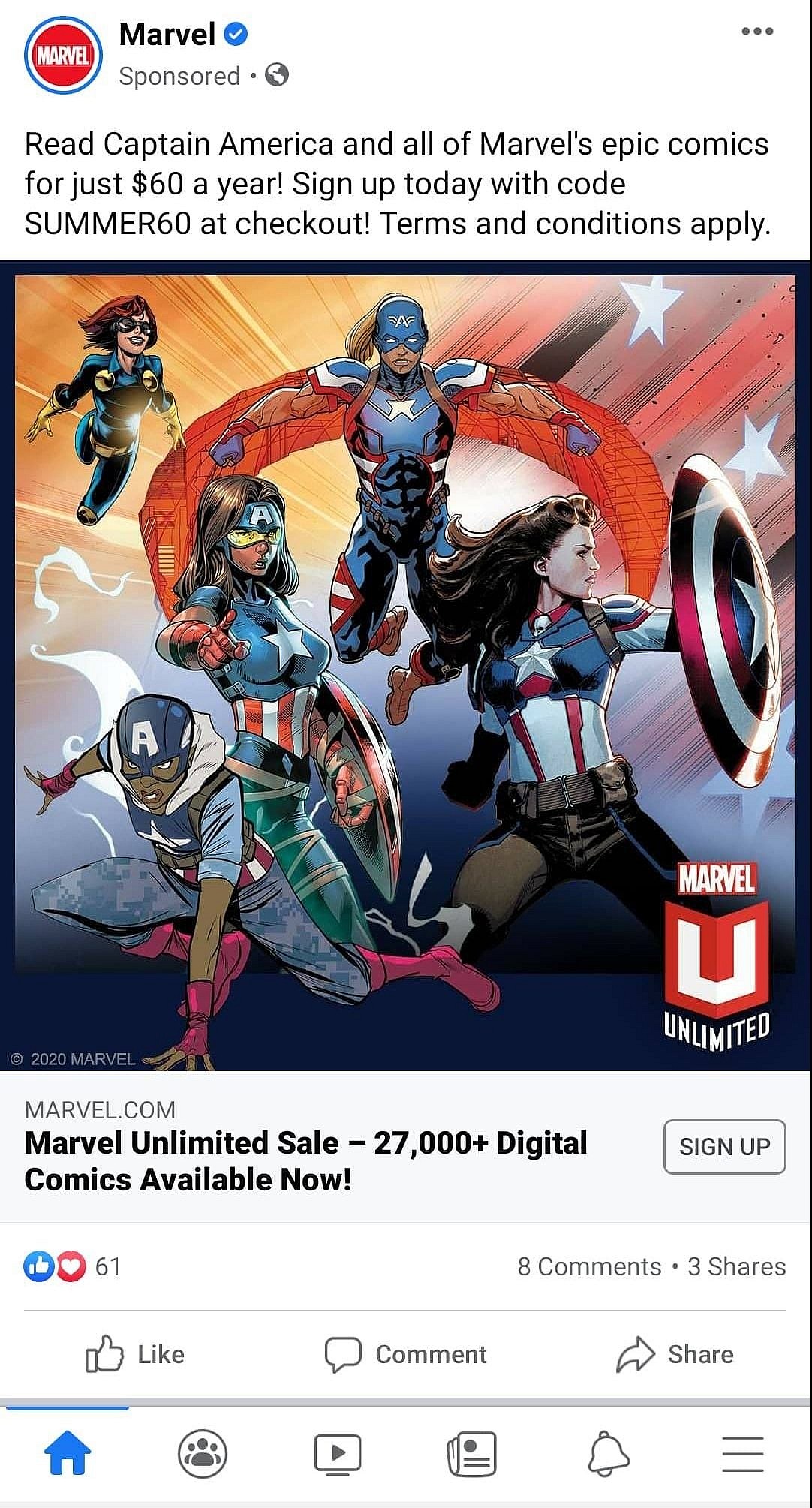 Marvel Comics is currently running an ad campaign on Facebook using Captain America to promote their digital comics platform Marvel Unlimited.