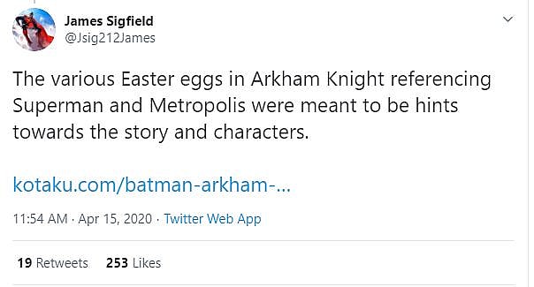 In a subsequent tweet Sigfield stated, “The various Easter eggs in Arkham Knight referencing Superman and Metropolis were meant to be hints towards the story and characters.”