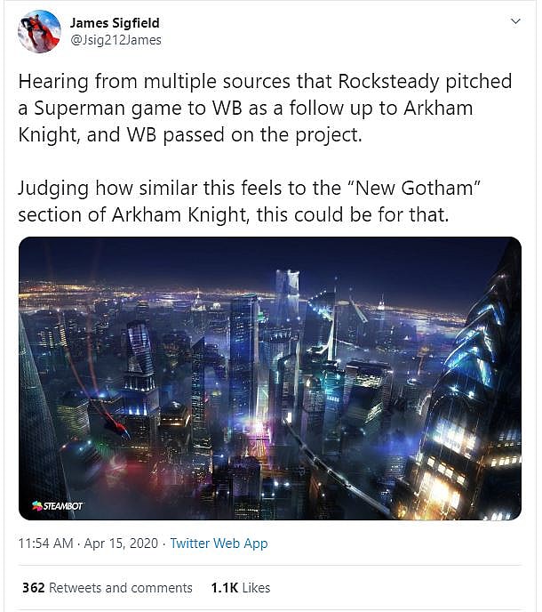 Geeks WorldWide reporter James Sigfield had reported, “Hearing from multiple sources that Rocksteady pitched a Superman game to WB as a follow up to Arkham Knight, and WB passed on the project.”