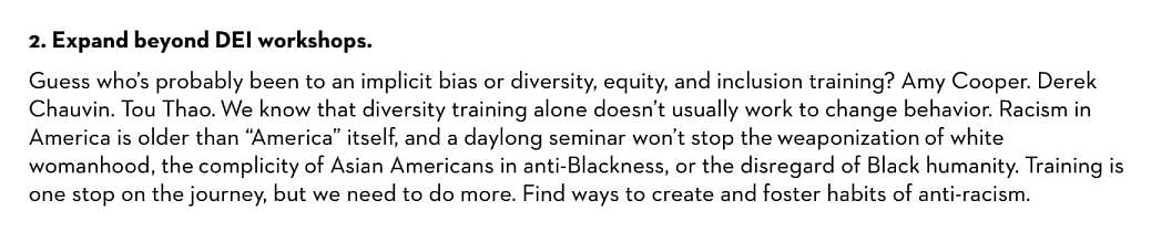 They then specifically target white women and Asian Americans saying, “Racism in America is older than ‘America’ itself, and a daylong seminar won’t stop the weaponization of white womanhood, the complicity of Asian Americans in anti-Blackness, or the disregard of Black humanity.”