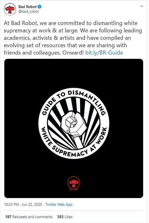 Then a couple of weeks later towards of the end of June Abrams’ Bad Robot shared an employee guide titled, “Bad Robot’s Guide to Dismantling White Supremacy at Work.