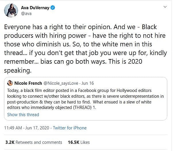 DuVerany wrote on Twitter, “Everyone has a right to their opinion. And we – Black producers with hiring power – have the right to not hire those who diminish us. So, to the white men in this thread… if you don’t get that job you were up for, kindly remember… bias can go both ways. This is 2020 speaking.”