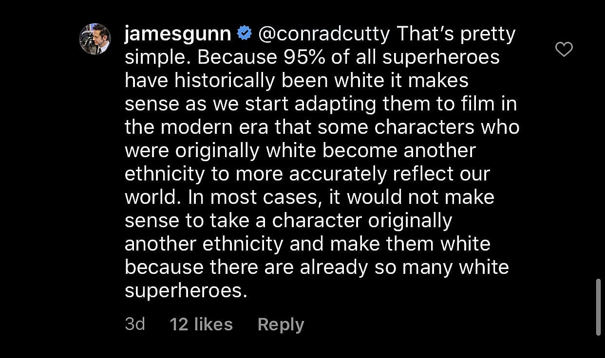Gunn then responded by informing the fan that race-swapping was done “because 95% of all superheroes have historically been white [o] it makes sense as we start adatpting them to film in the modern era that some characters who were originally white become another ethnicity to more accurately reflect our world.
