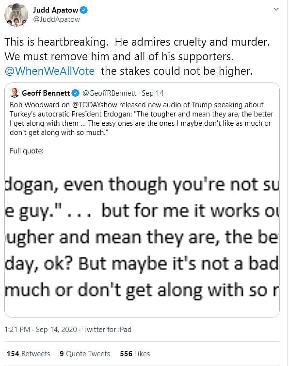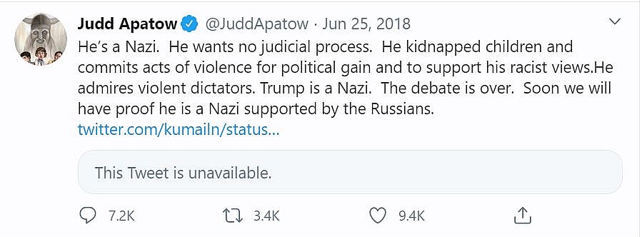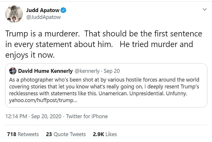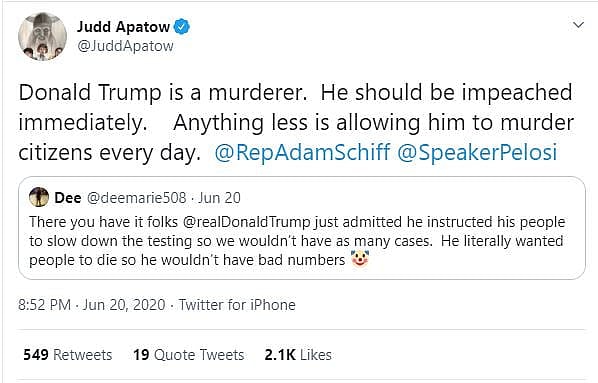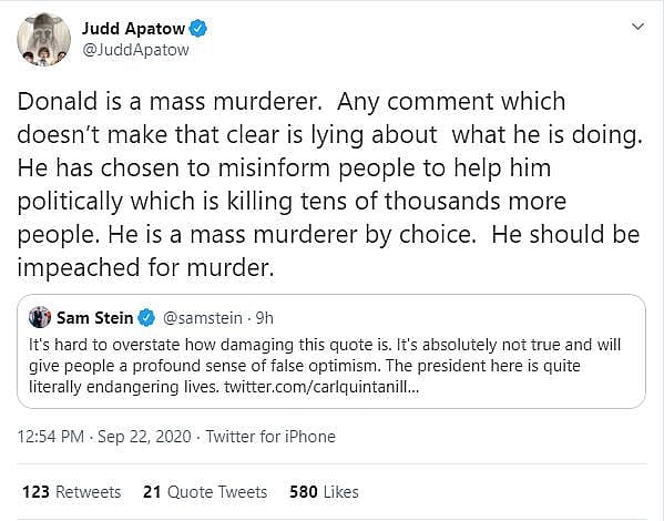 In June, Apatow wrote, “Donald Trump is a murderer. He should be impeached immediately. Anything less is allowing him to murder citizens every day.”