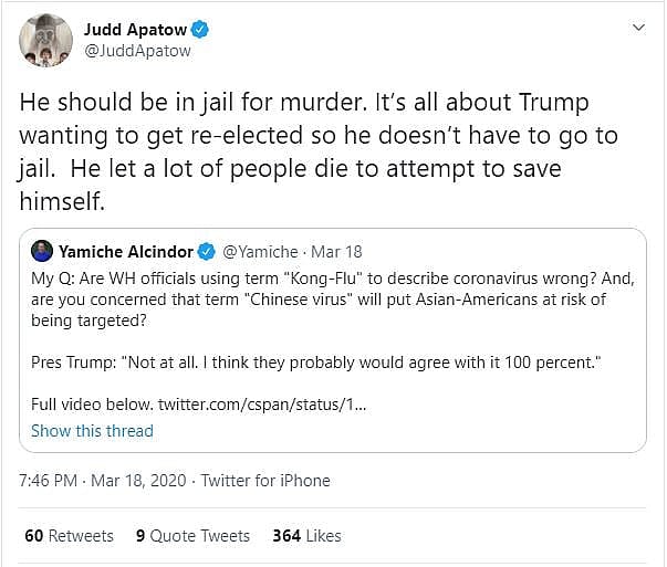 Apatow is no stranger to political rhetoric, although this his repeated attempts at calling President Trump a murderer is something new to 2020.