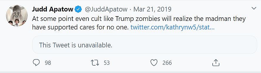 Back in 2019, Apatow was calling Trump supporters “cult like Trump zombies.”