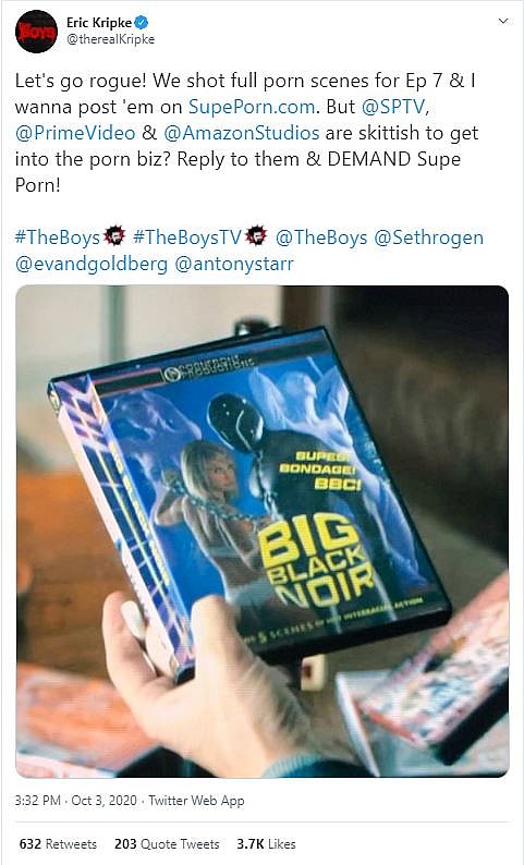 Kripke took to Twitter where he posted, “Let’s go rogue! We shot full porn scenes for Ep 7 & I wanna post ’em on SupePorn.com. But Sony Pictures Television, Prime Video, and Amazon Studios are skittish to get into the porn biz?”