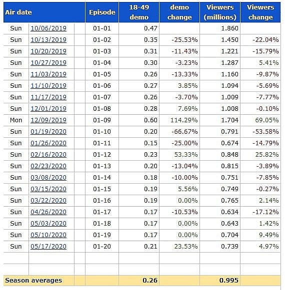 In another comparison, Batwoman’s recent first season debuted with 1.860 million viewers with a .47 rating in the 18-49 demographic.