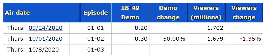 Star Trek: Discovery’s Season 1 Episode 1 debut on the much larger CBS network only had a .20 18-49 demographic rating. It was viewed by 1.702 million people.