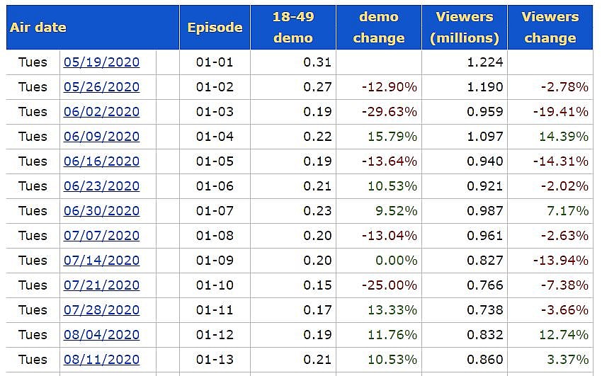 The show would eventually conclude with its final episode seeing 860,000 total viewers and a rating of .21. On average the show had viewership of 946,000 people per episode and a .21 rating.