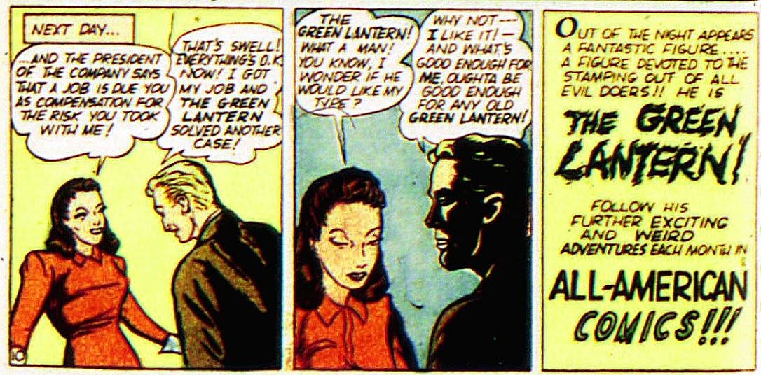 He tells Irene, “Why not — I like it! And what’s good enough for me, oughta be good enough for any old Green Lantern!” His comment came in response to Irene wondering if the Green Lantern would be attracted to her.