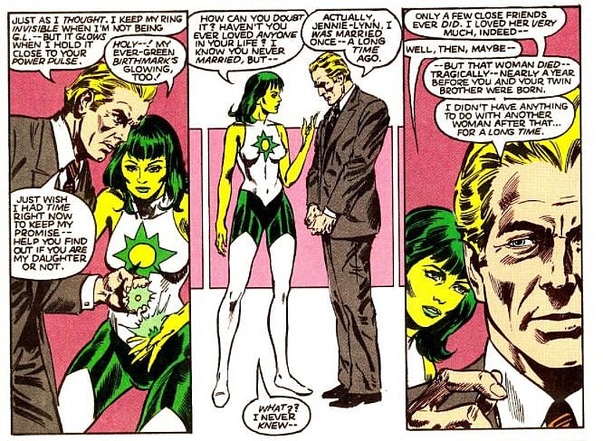 Later in the issue it would be revealed that Jade and her twin brother Obsidian are actually his children with the villain Thorn aka Rose Canton. However, at the time of her marriage to Alan Scott she was using the identity of Alyx Florin.