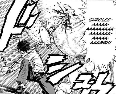 When confronted by the villain Crablante, who is hunting a kid with a cleft chin, Saitama interferes and uses his tie as a weapon to rip off Crablante’s eye and defeat the giant monster.