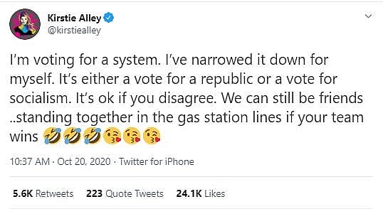 Allie has not personally responded to either Sirtis or Takei. However, she did tweet, “I’m voting for a system. I’ve narrowed it down for myself. It’s either a vote for a republic or a vote for socialism. It’s ok if you disagree.”