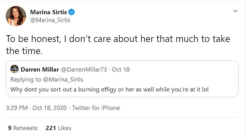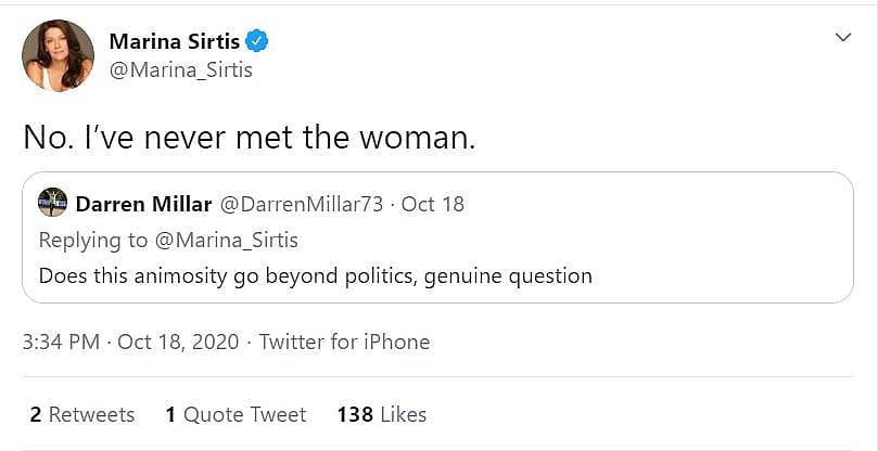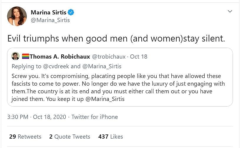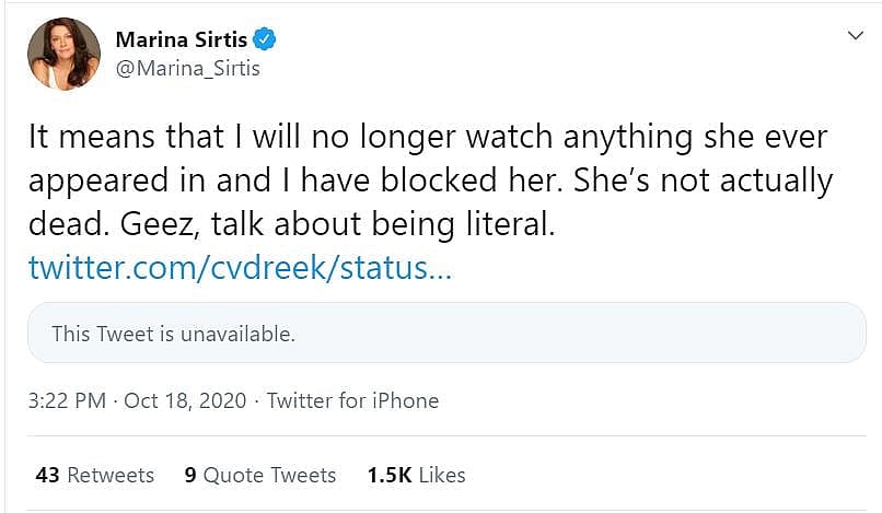 In response to this tweet, Star Trek: The Next Generation actress Marina Sirtis, who plays Deanna Troi, wrote on Twitter, “You are now dead to me.”