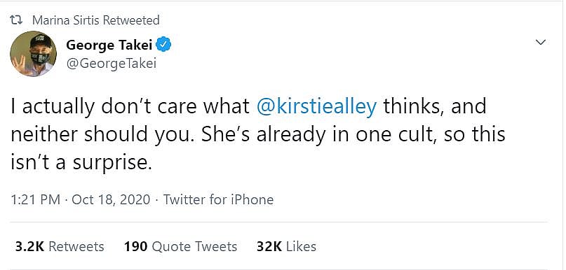 Sirtis wasn’t alone in responding to Alley. Star Trek: The Original Series actor George Takei also responded. He wrote, “I actually don’t care what Kirstie Alley thinks, and neither should you.”