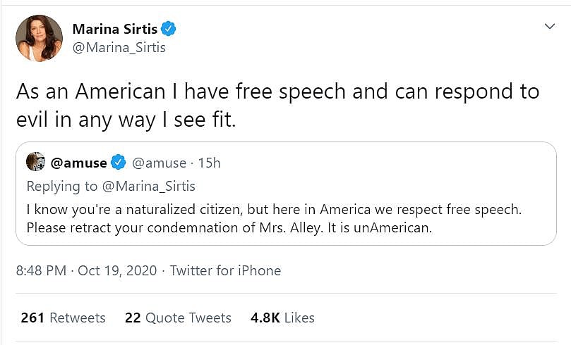 She wrote, “As an American I have free speech and can respond to evil in any way I see fit.”