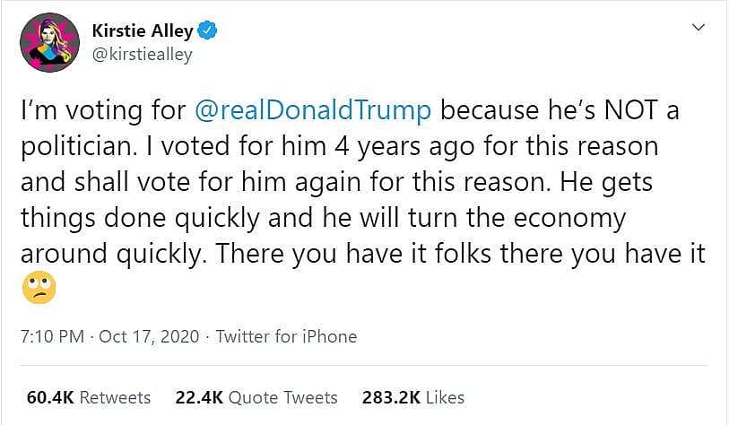On October 17th, Alley, who played Saavik in Star Trek II: The Wrath of Khan, took to Twitter where she wrote, “I’m voting for Donald Trump because he’s NOT a politician. I voted for him 4 years ago for this reason and shall vote for him again for this reason.”