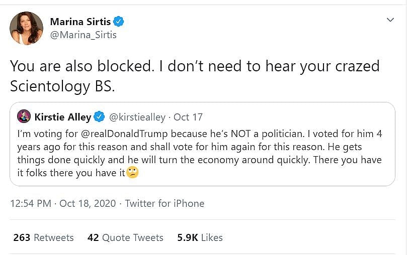 She added, “You are also blocked. I don’t need to hear your crazed Scientology BS.”