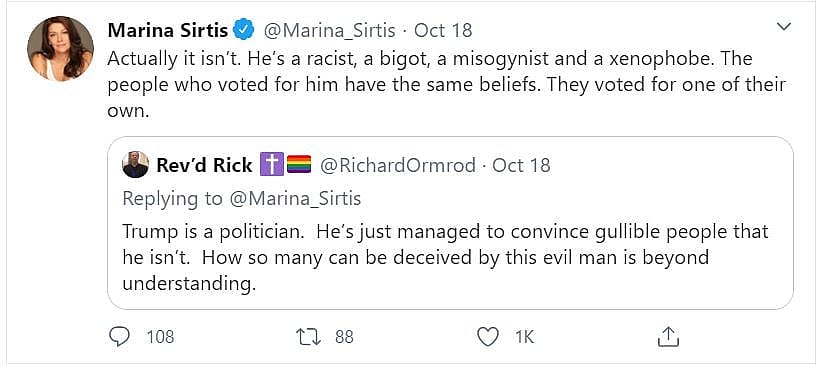 She wrote, “He’s a racist, a bigot, a misogynist and a xenophobe. The people who voted for him have the same beliefs. They voted for one of their own.”