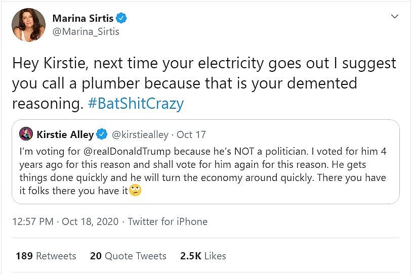 Then she wrote, “Hey Kirstie, next time your electricity goes out I suggest you call a plumber because that is your demented reasoning.” She then described her as “Bat shit crazy.”