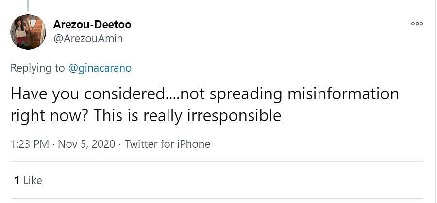 @ArezouAmin wrote, “Have you considered…not spreading misinformation right now? This is really irresponsible.”