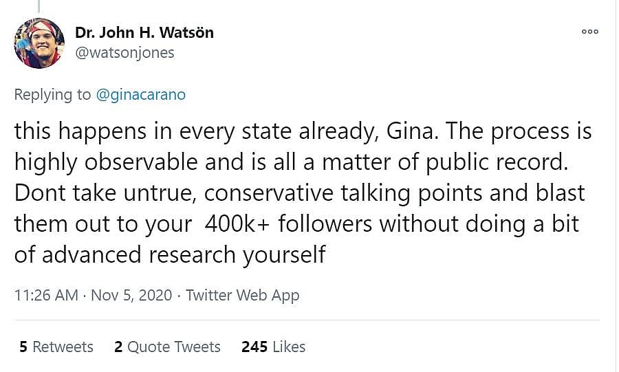 “This happens in every state already, Gina. The process is highly observable and is all a matter of public record,” wrote user @WatsonJones.