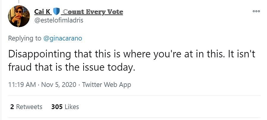 Another wrote, “What voter fraud? Also if the GOP would’ve allowed mail-in voting ballots to be counted early we wouldn’t be waiting.”
