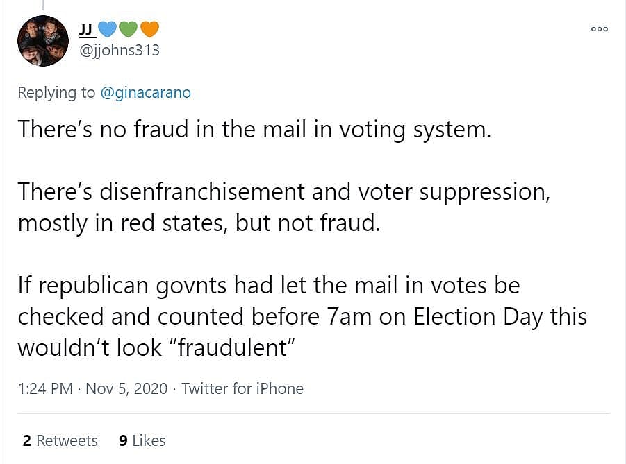 “There’s no fraud in the mail in voting system. There’s disenfranchisement and voter suppression, mostly in red states, but not fraud,” wrote @jjohns313.