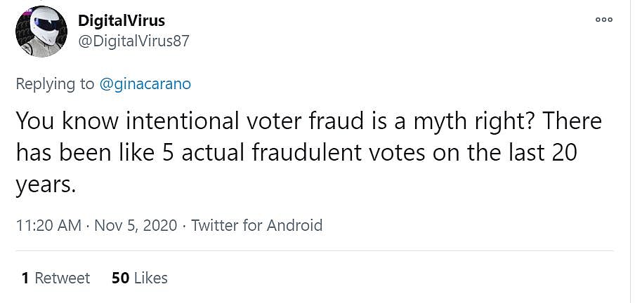 And user @DigitalVirus87 wrote, “You know intentional voter fraud is a myth right? There has been like 5 actual fraudulent votes on the last 20 years.”