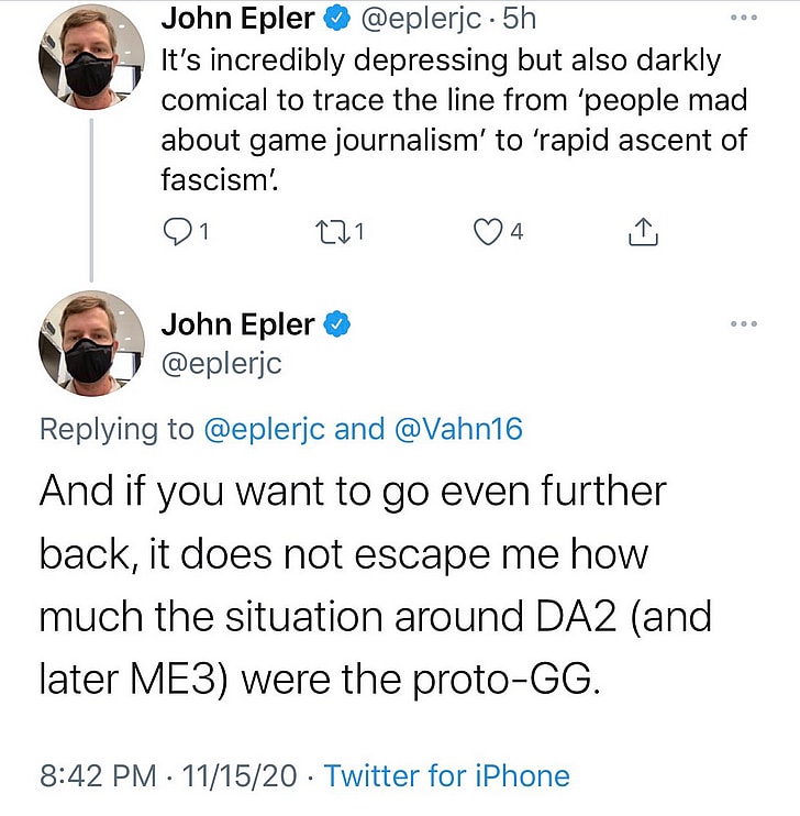 In a pair of tweets, deleted prior to an archive being hosted on a third-party site and directed towards Grayson, Epler would assert that it was “incredibly depressing but also darkly comical to trace the line from ‘people mad about game journalism’ to ‘rapid ascent of fascism’.
