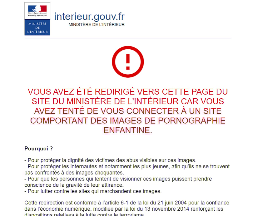 According to the warning, users were being “redirected to this page by the Ministry of the Interior because you have attempted to connect to a site containing image of child pornography”, an act which was being done in order to “protect the dignity of the victims of abuse seen in the images” and “protect the internet users and especially the very young, who did not want to find these shocking images.”