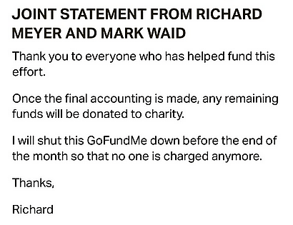 On his Patreon account, Meyer published the joint statement alongside a message of thanks “to everyone who has helped fund this effort,” and proceeded to announce to his supporters that “once the final account is made, any remaining funds will be donated to charity.”