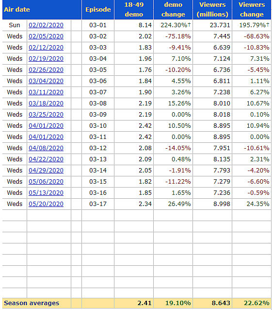 TV Series Finale reports the show clocked in with 20.404 million people tuning in and a 5.08 rating in the 18-49 demographic. Those numbers might seem extremely impressive especially if you compare them to a show like Batwoman, which isn’t even watched by one million people on a weekly basis.