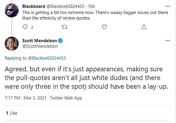 He followed that up writing, “Agreed, but even if it’s just appearances, making sure the pull-quotes aren’t all just white dudes (and there were only three in the spot) should have been a lay-up.”
