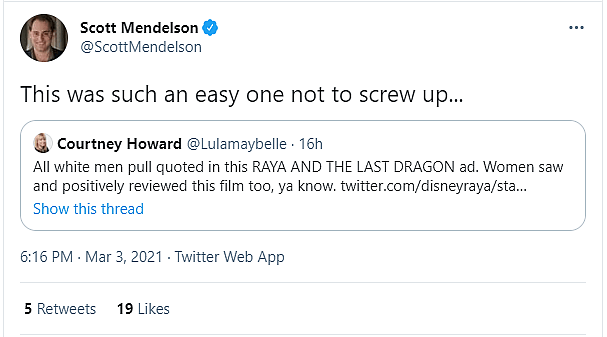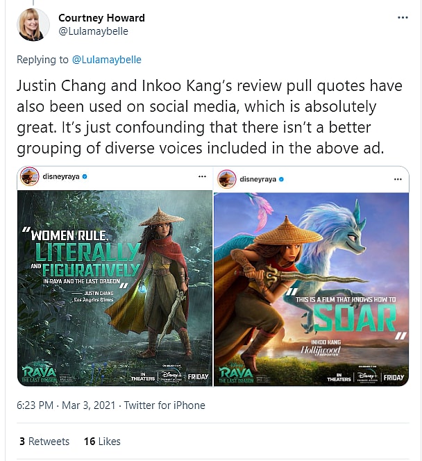 Variety writer Courtney Howard took to Twitter where she wrote, “All white men pull quoted in this RAYA AND THE LAST DRAGON ad. Women saw and positively reviewed this film too, ya know.”