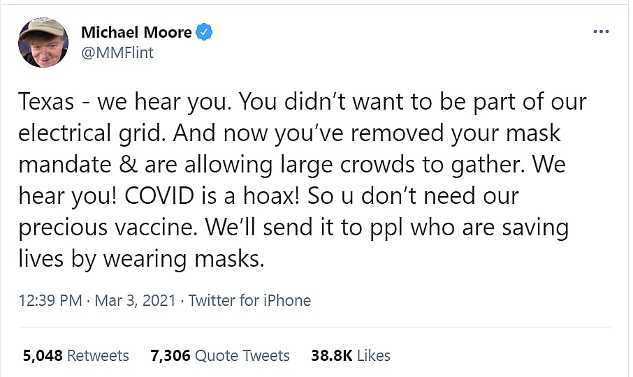 Filmmaker and political activist Michael Moore railed against Texas after the governor lifted all restrictions previously placed on the state in response to the COVID-19 pandemic.
