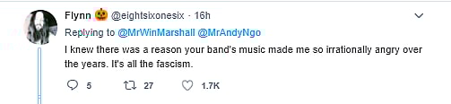 Another wrote, “I knew there was a reason your band’s music made me so irrationally angry over the years. It’s all the fascism.”
