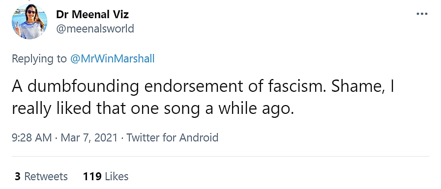 A NHS doctor tweeted, “A dumbfounding endorsement of fascism. Shame, I really liked that one song a while ago.”