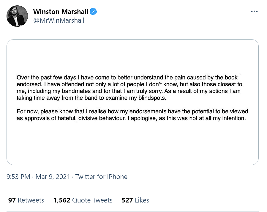 He wrote, “Over the past few days I have come to better understand the pain caused by the book I endorsed. I have offended not only a lot of people I don’t know, but also those closet to me, including my bandmates and for that I am truly sorry.”