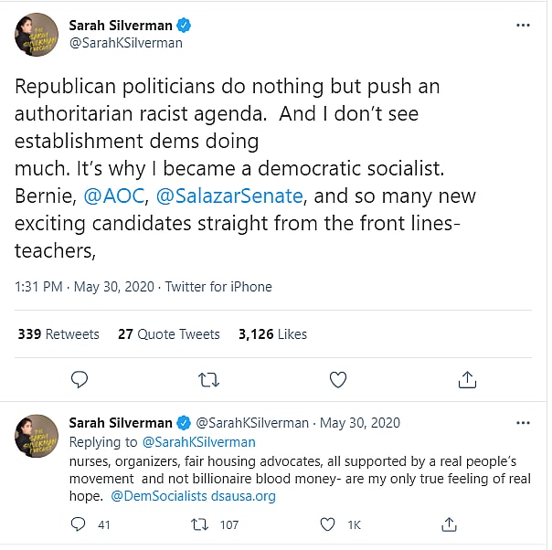 Back in May 2020, Silverman tweeted, “Republican politicians do nothing but push an authoritarian racist agenda. And I don’t see establishment dems doing much, It’s why I became a democratic socialist. Bernie, AOC, Julia Salazar, and so many new exciting candidates straight from the front lines – teacher, nurses, organizers, fair housing advocates, all supported by a real people’s movement and not billionaire blood money- are my only true feeling of real hope.”