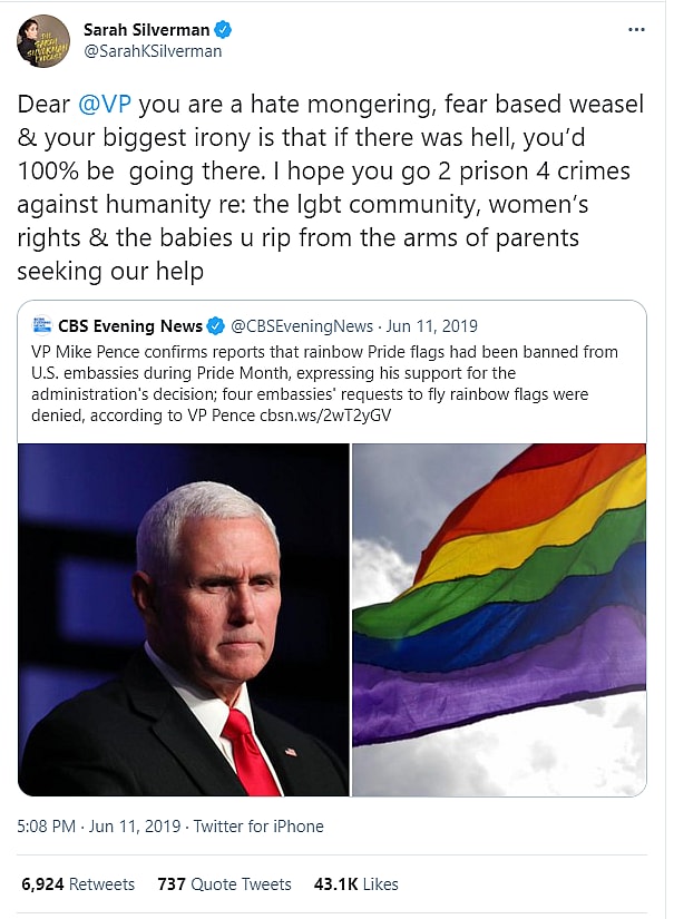 She tweeted, “Dear VP you are a hate mongering, fear based weasel & your biggest irony is that if there was hell, you’d 100% be going there. I hope you go 2 prison 4 crimes against humanity re: the lgbt community, women’s rights & the babies u rip from the arms of parents seeking our help.”