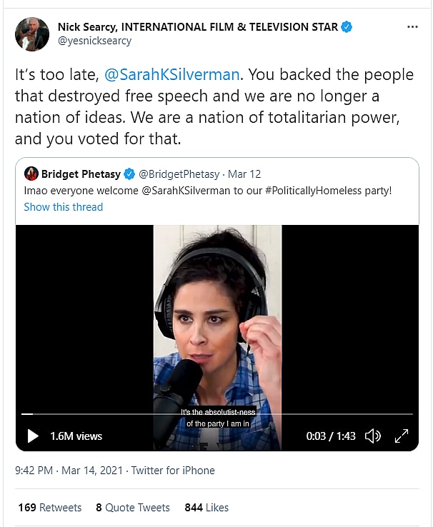 Searcy would respond to the Silverman’s comments shared to Twitter by Bridget Phetasy writing, “It’s too late, Sarah Silverman. You backed the people that destroyed free speech and we are no longer a nation of ideas. We are a nation of totalitarian power, and you voted for that.”