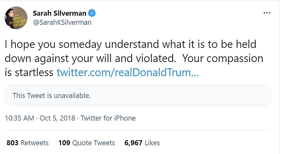 She tweeted, “I hope you someday understand what it is to be held down against your will and violated. Your compassion is startless.”