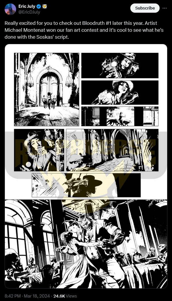 Sharing the page to his own personal Twitter account, July himself asserted, “Really excited for you to check out Bloodruth #1 later this year. Artist Michael Montenat won our fan art contest and it’s cool to see what he’s done with the Soskas’ script.”